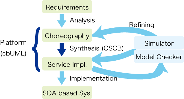 SOAとはサービスの連携により全体システムを構築するという考え方です. 全体を俯瞰してサービスがどのように連携するのかを記述したものをコレオグラフィとよびます. これに対して,個々のサービスがどのように振る舞うのかを記述したものをサービス実装とよびます. コレオグラフィからサービス実装を求める問題はコレオグラフィ実現問題として知られています. また,サービス実装がコレオグラフィを満足するのかを調べる問題はコレオグラフィ一致問題として知られています.