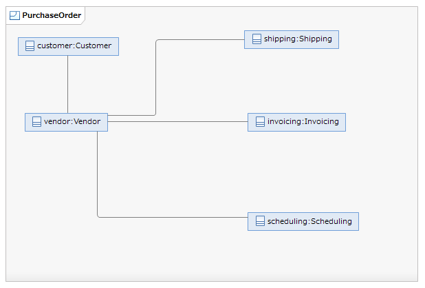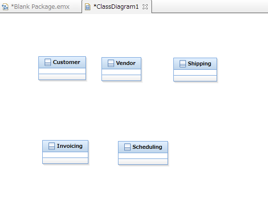 次に,クラス図を作成します.この例では,Customer, Vendor, Shipping, Invoicing, Schedulingのサービスが存在しますので,それらのクラスを作成します.