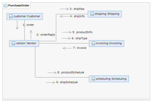 Schedulingへの指令はproductScheduleとshipScheduleです.ここで,VendorはproductScheduleについてはorderを受けるとすぐに送信しますが,shipScheduleはshipInfoを受信した後に送信します.