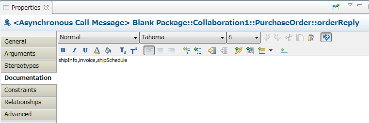 CSCB Toolsではメッセージの「文書」に先行するメッセージを記述することにします. 例えば,orderReplyにはshipInfo, invoice, shipScheduleが先行するので,orderReplyの文書に下図のような記述を追加します.