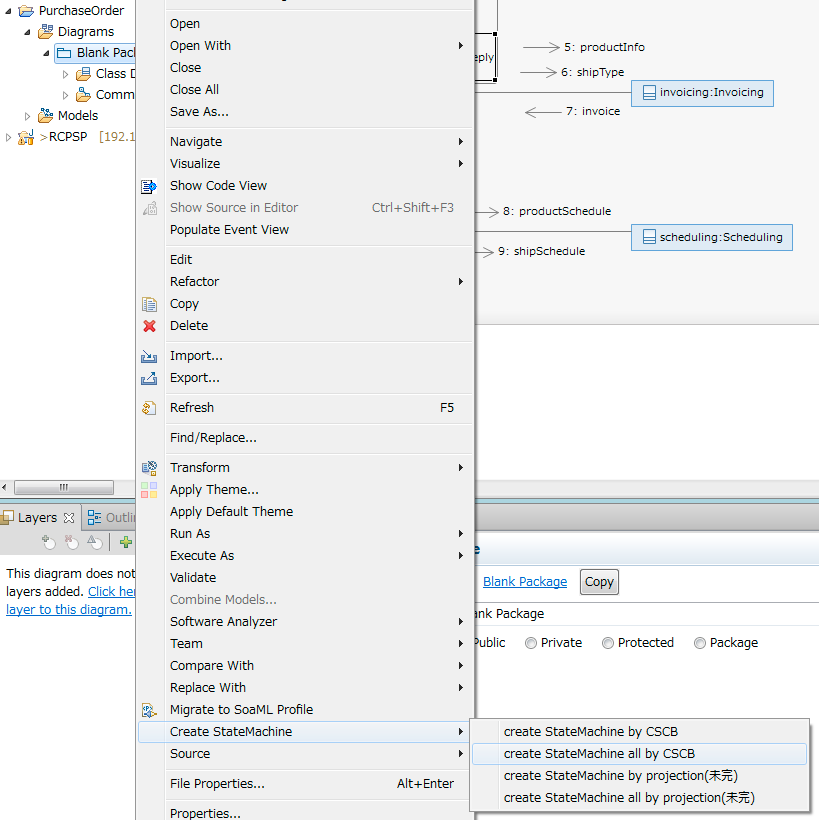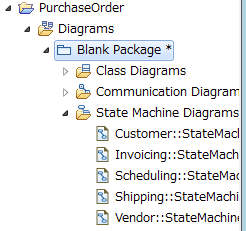 特に問題が無ければ,状態機械が合成され,モデルに追加されます. ちょっとわかりづらいですが,上の図のPurchaseOrder?プロジェクトのBlanc Packageにはクラス図とコミュニケーション図しかありませんが,下図では各サービスの状態機械が追加されています.