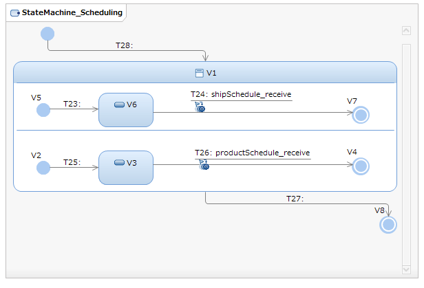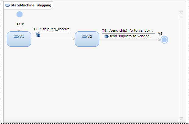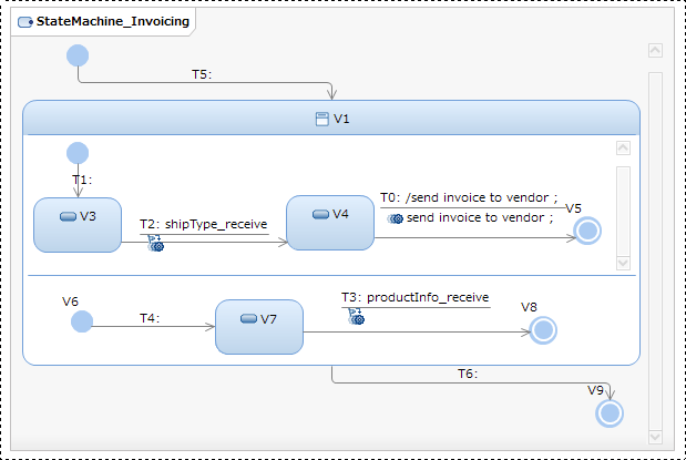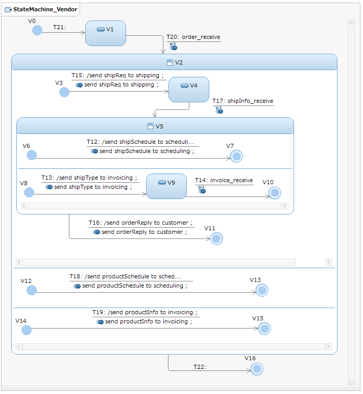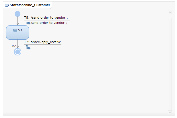 初期疑似状態から状態V1への遷移において,操作"send order to vendor"(vendorにメッセージorderを送信する)を実行し,事象orderReply_receiveの生起により終了状態に遷移しています.
